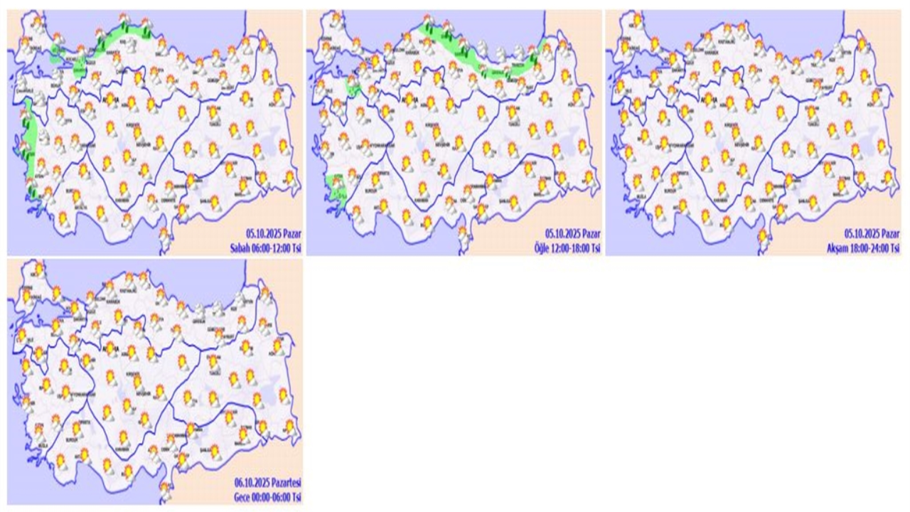 Meteoroloji Genel Müdürlüğü’nden alınan bilgilere göre, bugün yurdun kuzey ve batı kesimlerinde parçalı, yer yer çok bulutlu hava bekleniyor. Kıyı Ege, İstanbul, Sakarya, Bursa, Zonguldak, Bartın, Sinop, Samsun, Rize, Ordu, Giresun, Trabzon, Kastamonu ve Artvin çevrelerinde ise yağmur ve sağanak yağışlar görülebilir. Diğer bölgelerde ise az bulutlu ve açık bir hava hakim olacak. Batı kesimlerde hava sıcaklıkları mevsim normalleri civarında seyrederken, diğer yerlerde mevsim normallerinin üzerinde seyretmesi bekleniyor. Rüzgar genellikle güney yönlerden hafif eserken, ara sıra orta kuvvette eseceği tahmin ediliyor. Meteorolojik uyarı olmadığı bilgisine de aktarıldı.